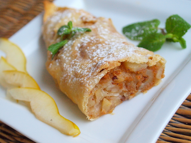 | Штрудель с грушами и фундуком.На прошлой неделе штрудель с яблоками был лидером заказов.В один день я испекла 6 штук! Поэтому хочу предложить штрудель с начинкой из груш, фундука и корицы с добавлением слегка карамелизированных сухариков. Цена 100 грн за большой штрудель |