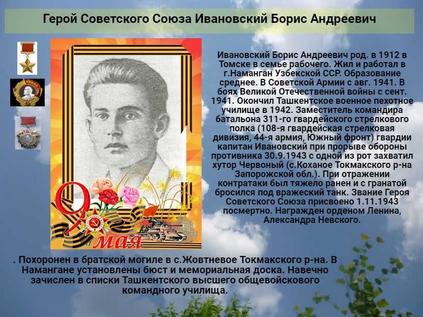 Ивановский Борис Андреевич род. в 1912 в Томске в семье рабочего. Жил и работал в г.Наманган Узбекской ССР. Образование среднее. В Советской Армии с авг. 1941. В боях Великой Отечественной войны с сент. 1941. Окончил Ташкентское военное пехотное училище в 1942. Заместитель командира батальона 311-го гвардейского стрелкового полка (108-я гвардейская стрелковая дивизия, 44-я армия, Южный фронт) гвардии капитан Ивановский при прорыве обороны противника 30.9.1943 с одной из рот захватил хутор Червоный (с.Коханое Токмакского р-на Запорожской обл.). При отражении контратаки был тяжело ранен и с гранатой бросился под вражеский танк. Звание Героя Советского Союза присвоено 1.11.1943 посмертно. Награжден орденом Ленина, Александра Невского. Похоронен в братской могиле в с.Жовтневое Токмакского р-на. В Намангане установлены бюст и мемориальная доска. Навечно зачислен в списки Ташкентского высшего общевойскового командного училища.