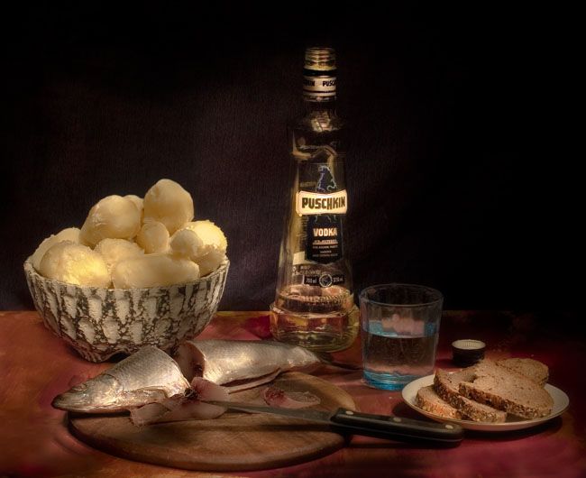 | 3 | Николай Горский На мой взгляд, миска слишком активная (не картошка, а сама миска). А бутылка такова, что всё уводит в направлении "лубка". Так и хотели? Пробка... не знаю добавляет ли она что-то... | |
